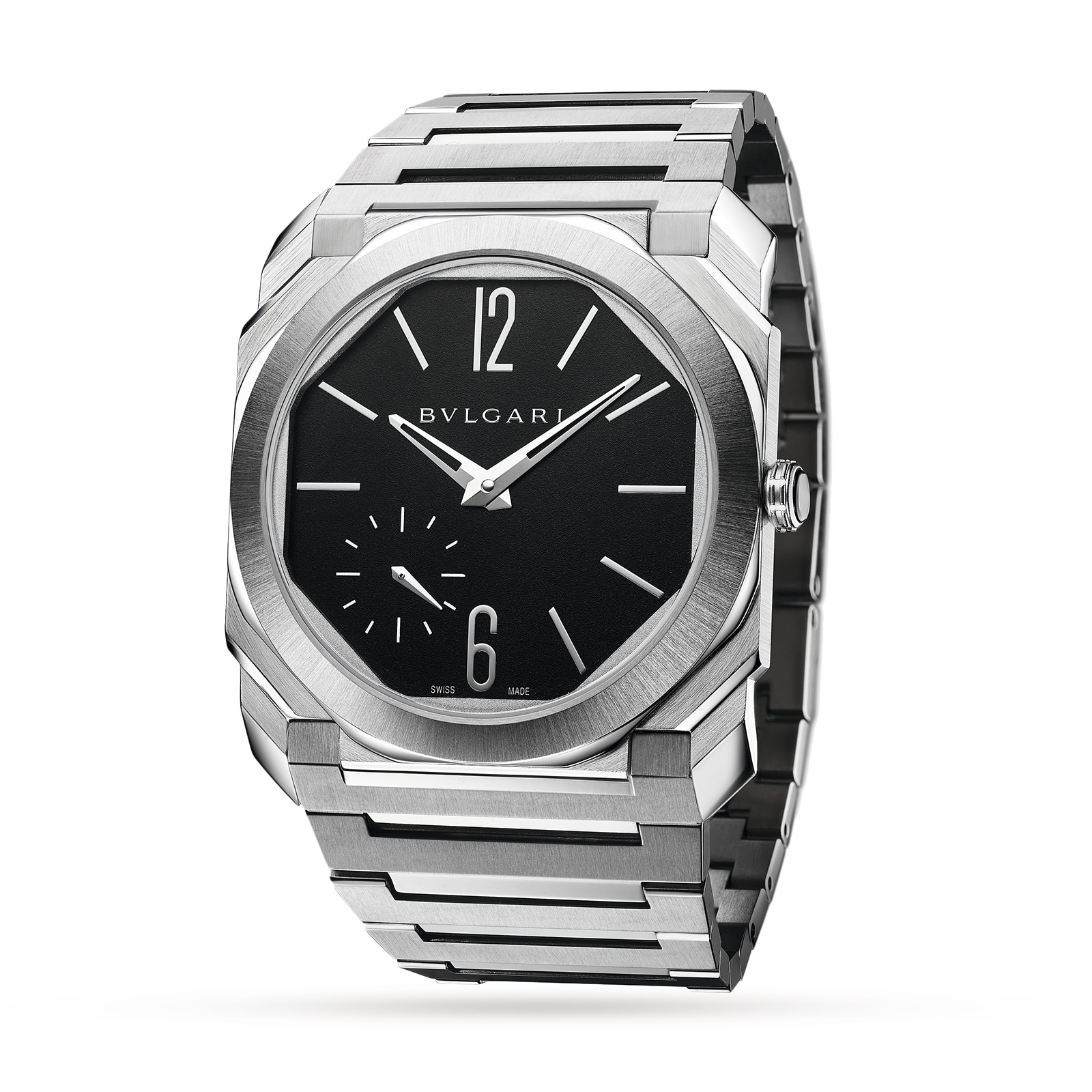 The Octo Finissimo Automatic watch channels the rare fusion of edgy Italian design and Swiss engineering with its innovative satin-polished finishes. With its ultra-appealing look and uncompromisingly forward-thinking mechanics, the groundbreaking timepiece is emblematic of Bvlgari’s integral bond between jewelry savoir-faire and watchmaking art. The Maison’s creative approach in working modern materials is here employed to set unforeseen design trends through the world of its Swiss-made timepieces. Octo Finissimo Automatic watch with mechanical manufacture movement, automatic winding, platinum microrotor and small seconds. BVL 138 caliber, 40 mm extra-thin satin-polished stainless steel case (6. 40 mm thick), transparent case back, polished stainless steel screw-down crown set with ceramic insert, Black dial and integrated satin-polished stainless steel bracelet with folding clasp. Water-resistant up to 100 metres.